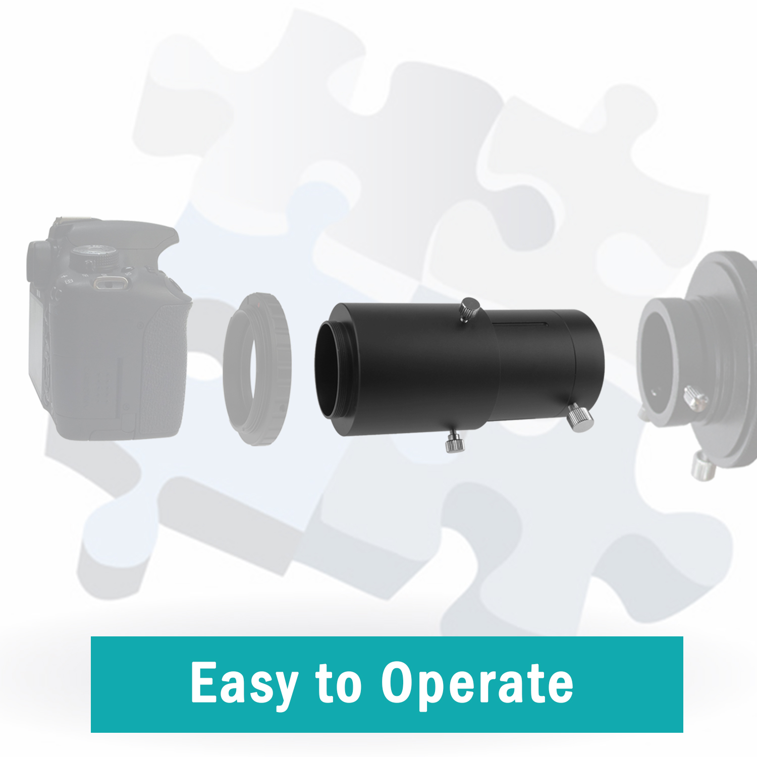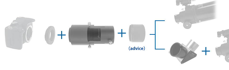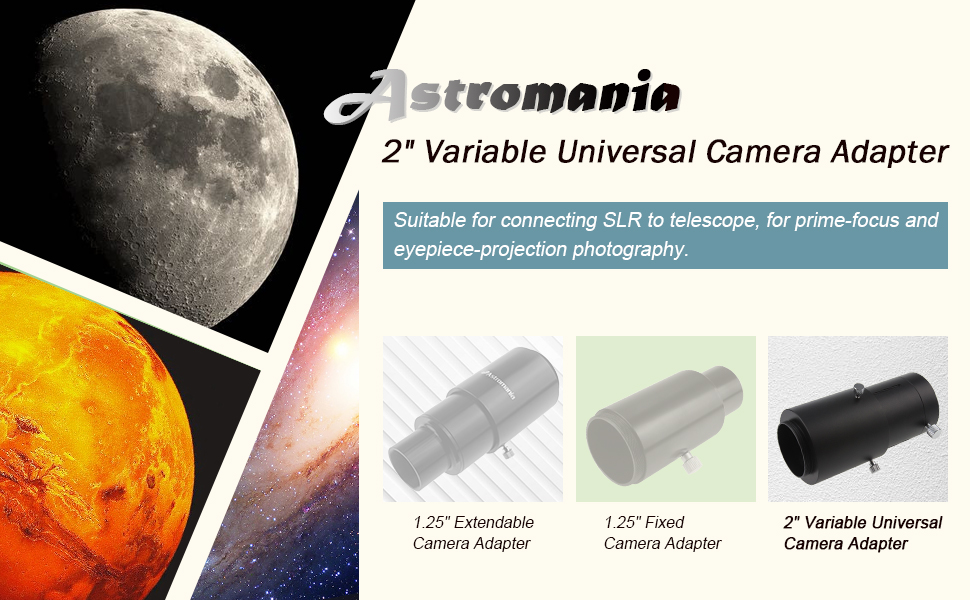 This easy to use 2" Variable Universal Camera Adapter is designed to attach both camera body and telescope together. Because of the limitation of the eyepiece locking screw, you'd better use it together with "2"/M48-extension Tube" to increase the contact area between the tube body and the focuser of telescope to achieve better stability.