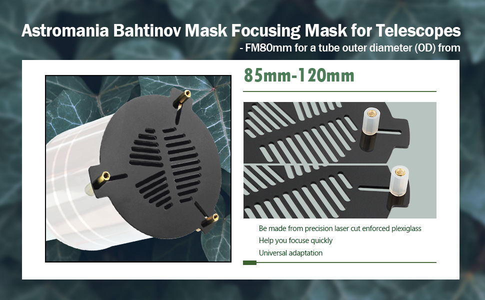 They are made from 2mm thick laser cut plexiglass and the securing screws are capped with soft plastic so that they do not damage your telescope.These high quality Bahtinov masks are adjustable to fit a wide range of optical tubes, unlike masks which are only able to fit one telescope. They have adjustment latitude of about 85-120mm, depending on model, in aperture making them very versatile.